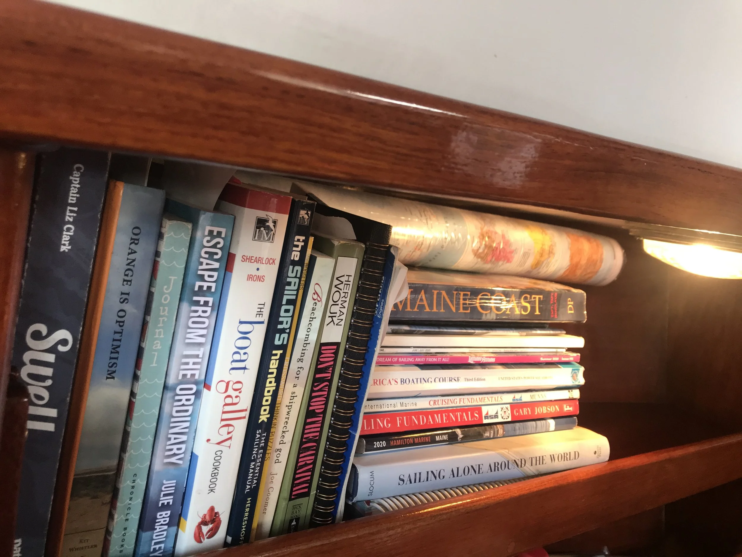 On deck you’ve got a ketch rig with an out of mast Hood main sail furler, a 135% Genoa with a Hood furler, and a Mizzen with battens and slugs. All sails can be rigged at the start of the season and set from the cockpit, you never have to leave the cockpit to control sails. NOTE: Both furlers will need attention. We have replaced all halyards and sheets (though they have been in the Maine winters so they should be replaced again soonish). We installed all new life lines in 2021 and secured and upgraded many of the stations while rebedding all of them. Standing rigging has turnbuckles and is very hardy with this being a blue water cruiser. There are seacocks on all thru hulls below waterline and gate valves on all thru hulls above waterline. In 2021 we updated the stern railing system to allow for the hauling and storing of our dinghy engine and to accommodate our solar panels. We installed a steel outboard motor lift with a mounting panel for safekeeping while underway. There is a massive storage locker on the back deck, the beauty of a center cockpit is you have a lot of space back there, perfect spot for beanbags and a fishing pole. There is a Magma stern rail mounted gas grill and fishing pole holder. Life is beautiful looking out over the stern while cooking dinner at anchor.