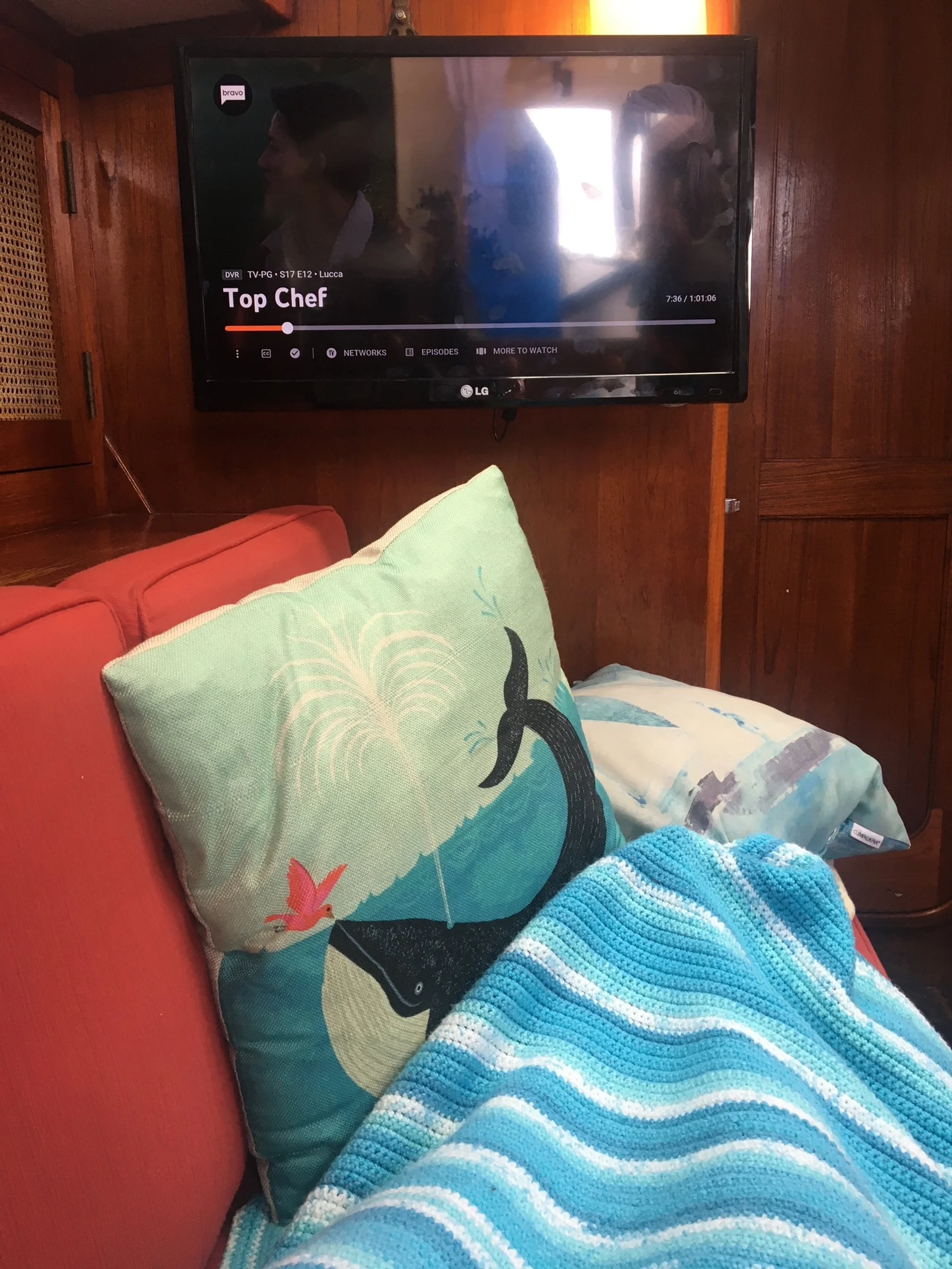 Imagine a 2 bed, 2 bath home with an amazing deck on the water? Watching the seabirds, feeling the seabreeze, smelling the briny air as you grill on the back deck? What would that cost? Surely a lot more than $40,000, right? All this and more can be yours! Zephyr was our summer home for 12 summers and 5 winters. We loved living aboard and felt very much at home aboard this beautiful boat. Being surrounded by the rich mahogany walls, teak and holly floors, warm lighting and cozy interiors made us (and obviously our dog, see below) feel so cozy and happy when below decks.